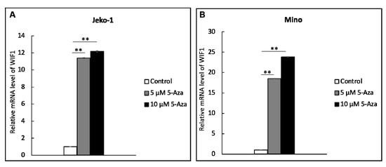 The expression of WIF1 mRNA was dramatically increased in (A) JeKo-1 and (B) Mino cells after the treatment with the demethylating agent, 5-aza. ** p value < 0.001.