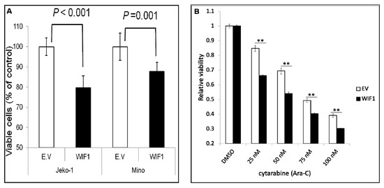 We then assessed if the restoration of WIF1 by gene transfection can induce any biological changes. As shown in Figure 5A, transfection of WIF1 significantly reduced the cell growth by 20–30% in both JeKo-1 and Mino cells. Triplicate experiments were performed, and results from a representative run are illustrated. Furthermore, WIF1-transfected JeKo-1 cells sensitized these cells to the chemotherapeutic drug cytarabine (Ara-C). Ara-C was added to WIF1-transfected JeKo-1 cells 24 h after the gene transfection, the number of viable cells was quantified using MTS assay 48 h after the addition of Ara-C. As shown in Figure 5B, restoration of WIF1 significantly sensitized JeKo-1 cells to Ara-C-induced inhibition on cell growth.