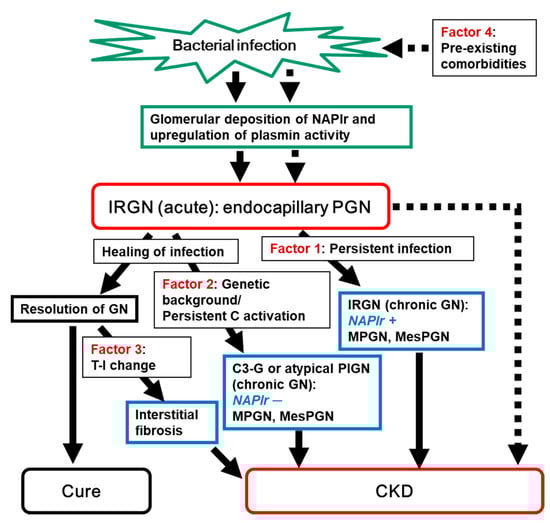 Summary of the concept of this review. Induction of IRGN and its outcome are summarized. IRGN may cure completely or may progress into CKD. Four factors that may contribute to the progression of IRGN into CKD are depicted. Solid arrow indicates the main flow of induction of IRGN and its outcome. While dotted arrow indicate the flow of patients with pre-existing comorbidities (Factor 4). NAPlr: nephritis-associated plasmin receptor; IRGN: infection-related glomerulonephritis; PGN: proliferative glomerulonephritis; GN: glomerulonephritis; C activation: complement activation; MPGN: membranoproliferative glomerulonephritis; MesPGN: mesangial proliferative glomerulonephritis; T-I: tubulo-interstitial; C3-G: C3 glomerulopathy; PIGN: postinfectious glomerulonephritis; CKD: chronic kidney disease.