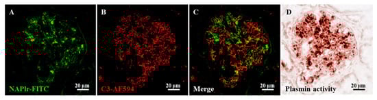 Representative photomicrographs of the histological staining for C3, nephritis-associated plasmin receptor (NAPlr), and plasmin activity in the glomeruli of a post-streptococcal acute glomerulonephritis (PSAGN) patient. (A–C) Double immunofluorescence (IF) staining for NAPlr (fluorescein isothiocyanate, green) and complement C3 (Alexa Fluor 594, red). Both NAPlr (A) and C3 (B) were positive in the glomeruli, but they generally were not colocalized, as shown in the merged image (C). (D) Plasmin activity assessed by in situ zymography on a serial section was found to be positive, and to have a similar distribution to the NAPlr staining in the glomeruli. Details of all staining methods have been described previously [].