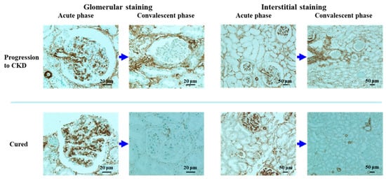 In 1961, Jennings and Earle [] reported that the degree of interstitial reaction is one of the main factors determining whether PSAGN becomes chronic or not. Similar findings have actually been reported more generally, i.e., the progression of glomerular disease correlates more closely with interstitial lesions than with glomerular lesions [,,,].