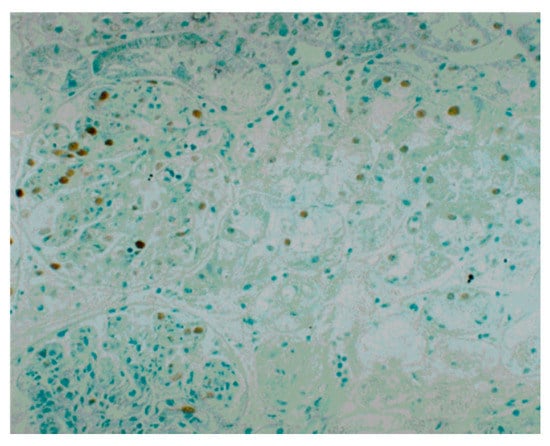 Immunoperoxidase staining for proliferating cell nuclear antigen (PCNA) and counterstaining with methyl green in a renal biopsy tissue from a PSAGN patient (original magnification, ×100) []. Prominent expression of PCNA in the glomerulus and tubular epithelial cells was observed. The distribution of PCNA-positive cells was variable; i.e., there was a considerable difference in the number of PCNA-positive cells between each glomerulus and between different parts of the tubules.