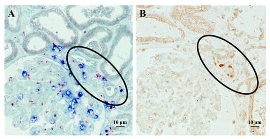 Staining of infiltrating cells and PCNA in serial sections of renal biopsy tissue from a patient with PSAGN. Double staining for neutrophils (chloroesterase staining: blue) and macrophages (immuno-alkaline phosphatase staining for CD11c: red) demonstrated extensive glomerular infiltration of both cell types, which spread out from the vascular pole (circled region) (A). Tubular epithelial cells of the same region (circled) showed positive PCNA staining (immunoperoxidase staining: brown) on a serial section (B). Details of all the staining methods have been described previously [].