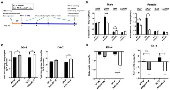 Body profiles of AdipoR1 mice upon cold exposure. (A) Wild-type (WT) and transgenic adiponectin receptor 1 (AdipoR1) mice of both sexes, male (M) and female (F), were housed in a cold-room (8–10 °C) for two weeks, i.e., 14 d. (B) Percentage of adipose tissue weights was expressed per unit body weights in WT or AdipoR1 mice. Subcutaneous inguinal white adipose tissues (iWAT), gonadal/epididymal white adipose tissues (gWAT), classical interscapular brown adipose tissues (BAT), and suprascapular white adipose tissues (supWAT) were harvested and weighted. (C) AdipoR1 mice had increased food intake (averaged g of feed per mouse per d/g of mouse body weights) while losing more body weight than WT mice. (D) AdipoR1 mice had significant body weight changes with enhanced body weight losses. Body weight changes were calculated and compared with each previous time point as percentage (%). Data were presented as means ± SEM (n = 3–8 for each group). * p ≤ 0.05; ** p ≤ 0.01; *** p ≤ 0.001.