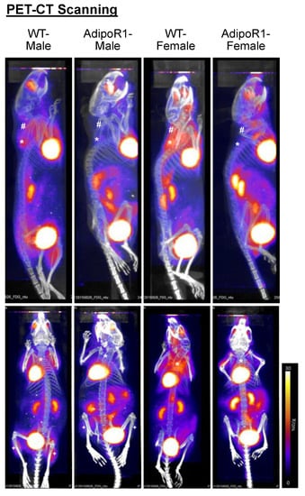 To record live glucose uptake in vivo for BAT activity during cold stimulation in BAT and browned WAT, a PET/CT scanning with 2-deoxy-2-[18F]fluoro-D-glucose (18F-FDG) injection to the WT and transgenic AdipoR1 mice was applied after cold-stimulation. AdipoR1 mice showed significant reduction of cold-induced radio-labeled glucose uptake in vivo in classical iBAT, browned supWAT and browned iWAT compared to WT mice (Figure 2). Constructed 3D videos showed panoramic views of inhibited cold-induced glucose uptake in AdipoR1 mice (Supplementary Materials). Both male and female AdipoR1 mice showed strong diminution, especially pronounced in AdipoR1 female mice. These results demonstrated AdipoR1 mice clearly exhibit decreased cold-stimulated glucose uptake in BAT, browned supWAT, and browned iWAT.