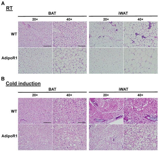 To confirm the inhibited cold-induced thermogenesis by PET/CT scanning in AdipoR1 mice, the structure of BAT and browned iWAT (the primary WAT browning depot) were examined by hematoxylin and eosin (H&E) staining. Higher BAT activity was revealed in WT female mice versus WT male mice by PET/CT scanning (Figure 2). Therefore, we focus on comparing WT female mice with AdipoR1 female mice. AdipoR1 female mice both at room temperature (RT, Figure 3A) and under cold exposure (Figure 3B) showed increased adipocyte size with larger lipid droplets both in BAT and browned iWAT than WT female mice. These results indicated AdipoR1 mice acquire lower browning/beiging effects and maintain relative “whitening” phenotypes in classical BAT and browned iWAT than tissues in WT mice both at RT and under cold environments.
