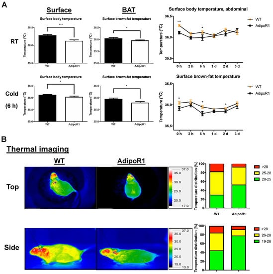 Reduced surface BAT depot temperature and surface body temperature of AdipoR1 mice. WT and transgenic AdipoR1 mice were evaluated for surface body temperature, (A) by infrared thermometer both at room temperature (RT) and after cold induction, and (B) by infrared camera after cold induction. Timeline and procedures were described in Figure 1. Measurements of surface body temperature (abdomen region) and surface depot temperature of BAT in (A) and infrared images from the thermographic surface temperature analysis in (B) in WT and AdipoR1 mice were both quantified and expressed as means ± SEM (n ≥ 8 for each group). * p ≤ 0.05; *** p ≤ 0.001.