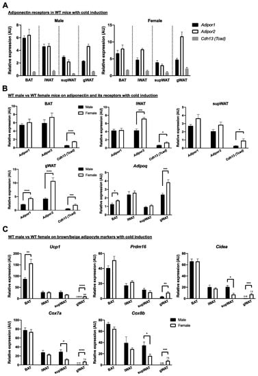 Female mice showed increased expression of adiponectin receptors and enhanced brown-adipocyte markers in classical brown and beige adipose depots after cold exposure. (A) Indicated adipose depots of male and female WT mice after cold acclimation were determined for expression of adiponectin receptors, including adiponectin receptor 1 (Adipor1), adiponectin receptor 2 (Adipor2), and T-cadherin (Cdh13/Tcad). (B) Comparison of expression of adiponectin receptors and adiponectin (Adipoq) between male and female WT mice was determined in iBAT, iWAT, supWAT, and gWAT, respectively. (C) Indicated adipose depots in male or female WT mice after cold acclimation were determined for expression of brown adipocyte (WAT browning/beiging) markers. Timeline and procedures were described in Figure 1. Classical iBAT, iWAT, supWAT (both of potential white adipose depots for browning or beiging) and gWAT in male and female WT mice were harvested, extracted and measured to evaluate adiponectin and its receptors and cold-induced thermogenic related genes (n = 3–8 for each group). Data were presented as relative means (normalized to β-actin in arbitrary units, AU) ± SEM. * p ≤ 0.05; **p ≤ 0.01; *** p ≤ 0.001; **** p ≤ 0.0001.