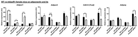 2.6. Reduced Adiponectin and Adiponectin Receptors in Adipose Tissues of AdipoR1 Female Mice Versus WT Female Mice under Cold Exposure