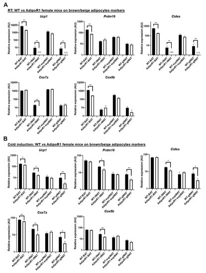 In this study, we found that these AdipoR1 female mice, after prolonged cold exposure, showed not only inhibited cold-induced BAT activity of glucose uptake assessed by PET/CT but also concomitant strong reduction of brown adipocyte markers, including thermogenic gene Ucp1, brown adipocyte markers Prdm16, Cidea, Dio2, Cpt1b, Elovl3, and Pgc1a, and BAT-specific mitochondrial markers Cox7a and Cox8b in classical BAT or browned iWAT. Furthermore, AdipoR1 female mice at RT already showed this diminished pattern which is even more pronounced in cold environments. In vitro gene expression analysis of brown adipocyte markers in differentiated beige adipocytes from iWAT of AdipoR1 mice also support in vivo results of PET/CT scanning and expression of brown adipocyte markers.