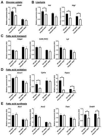 Reduced expression of glucose uptake, lipolysis, and fatty acid oxidation in classical brown and beige adipose depots of AdipoR1 mice after cold-stimulation. Gene expression related to (A) glucose uptake, (B) lipolysis, (C) fatty acid transport, (D) fatty acid oxidation, and (E) fatty acid synthesis was evaluated in indicated adipose tissues of WT and AdipoR1 female mice following cold exposure. Timeline and procedures were described in Figure 1. Classical iBAT and iWAT (the potential white adipose depot for browning or beiging) in WT and AdipoR1 female mice were harvested, extracted, and measured to evaluate adipose metabolism genes (n = 3–8 for each group). Data were presented as relative means (normalized to β-actin in arbitrary units, AU) ± SEM. * p ≤ 0.05; ** p ≤ 0.01.