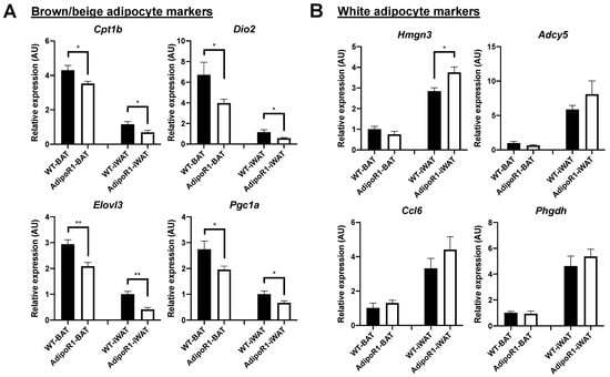 Reduced BAT markers (browning/beiging) and enhanced WAT markers (whitening) in classical brown and beige adipose depots of AdipoR1 mice after cold-stimulation. Expression of (A) brown and (B) white adipocyte markers was evaluated in indicated adipose tissues of WT and AdipoR1 female mice following cold exposure. Timeline and procedures were described in Figure 1. Classical iBAT and iWAT (the potential white adipose depot for browning or beiging), in WT and AdipoR1 female mice, were harvested, extracted, and measured to evaluate selective markers for brown or white adipocytes (n = 3–8 for each group). Data were presented as relative means (normalized to β-actin in arbitrary units, AU) ± SEM. * p ≤ 0.05; ** p ≤ 0.01.