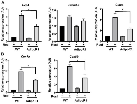 Decreased BAT thermogenic and mitochondrial markers in differentiated beige adipocytes from iWAT of AdipoR1 mice. Expression of (A) brown adipocyte markers and (B) BAT-enriched mitochondrial markers was evaluated by qPCR. Pre-adipocytes in the stromal/vascular fraction of subcutaneous iWAT (the potential depot for WAT browning or beiging) were derived from WT or transgenic AdipoR1 mice (n = 3) and differentiated into mature beige adipocytes with or without a synergistic browning agent of PPARγ, rosiglitazone (Rosi). Data were presented as relative means (normalized to β-actin in arbitrary units, AU) ± SEM. * p ≤ 0.05.
