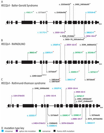 Pathogenic variants in RECQL4 have been linked to three syndromes: Rothmund–Thomson (RTS), Baller–Gerold (BGS) and RAPADILINO (RAdial hypo/aplasia, PAellae hypo/aplasia and cleft PAlate, DIarrhea and DIslocated joint, LIttle size and LImb malformation, NOse slender and NOrmal intelligence) (Figure 12 and Supplementary Table S2) [112,113,120,186,187,188,189]. All of these diseases are autosomal recessive and share growth retardation, cancer predisposition (osteosarcoma and lymphoma) and radial ray defects as symptoms [112,113,117,119,120,186,187,188,189]. RTS was the first to be described in the 19th century, but of course the gene affected in this disease was not found until more than a century later [120,187]. Kitao and coworkers investigated RECQL4 because RTS patients have chromosomal instability, growth retardation, hypogonadism and cancer predisposition similar to individuals with Bloom or Werner syndrome [120]. Bloom and Werner helicases are members of the RECQ helicase family and RECQL4 was recently identified as a new member of this family [120]. In addition to the symptoms that RTS has in common with Bloom syndrome, Werner syndrome, BGS and RAPADILINO, RTS individuals can also have photosensitivity with poikiloderma, graying hair, alopecia, hyperpigmented patches, telangiectasias, dystrophic teeth and dystrophic nails [112,113,118,121,122,187,190,191,192,193]. Many unique genetic variants have been demonstrated to be causative for RTS [112,113,117,123,124,125,126,127,128,129,130,131,132,133,134,135,136,137,138,139,187,191]. Patients afflicted with RTS usually have compound heterozygous mutations in RECQL4 with at least one nonsense mutation that causes a truncation, either deleting or disrupting the helicase domain (Figure 8 and Supplementary Table S1) [112,118,120].