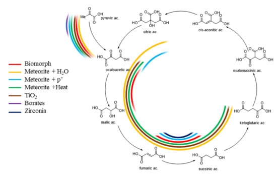 Figure 1 reports the tricarboxylic acid (rTCA) cycle (Krebs cycle) considered the prebiotic “core of the core” of metabolism [77,78,79]. The complexity of the Krebs cycle resides in the sequential transformation of different carboxylic acids with concomitant formation of other biomolecules. Biomorphs catalyze the synthesis of some intermediates of the Krebs cycle from HCONH2 (Figure 1, color code red). Other minerals, such as TiO2, and meteorites afforded a larger panel of intermediates, almost closing the whole cycle, while others were less effective. Thus, conditions may exist in which the ensembles of different minerals may interact synergically to increase the chemical complexity. In principle, no specific limits are expected if adequate reagent, catalysts and energy are available. For this to occur, an evolutionary advantage must be involved. In abiotic conditions, possible advantages could consist in: acquired stability of the products (i.e., higher stability of polymers relative to monomers), an increased fitness to the environment (i.e., higher solubility or solubility in different solvents), onset of cyclicity of the reactions, and reciprocal stabilization. These models are in principle universal. This observation opens the way to the consideration that further progress toward complexity is channeled by the specific environment in which these reactions occurred. If on Earth the “biomorph and silica” scenario prevailed because of the global scale and generality of these reactions, allowing the contemporaneous synthesis of the biogenic panels described above, in celestial bodies with a different geological history, the panels produced could have been different, leading to different local pre-LUCA systems [80,81]. Regardless, the facts that HCONH2 condensation always affords biomolecules, and that “exotic” compounds are essentially rare and limited, claims that the forms of chemical complexity that will eventually become biology are not likely to be basically different from the only one we know.