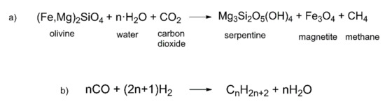 - McCollom, T.M. Abiotic methane formation during experimental serpentinization of olivine. Proc. Natl. Acad. Sci. USA 2016, 113, 13965–13970. [Google Scholar] [CrossRef]