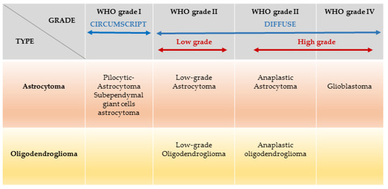 In 2007, the World Health Organisation (WHO), has classified brain tumours based on cell type and grading (grades I–IV), using histopathological criteria which refer to similarities with putative cells of origin and presumed levels of differentiation [10]. The plethora of recent advances made in genomic sciences, molecular pathology, immunology, and disease modelling, have increased the knowledge in brain tumour neurobiology, and define a new era in neuro-oncology. Consequently, in 2016, the WHO classification has undergone major reconstruction. Malignant tumours of the CNS are now classified not only based on histopathological findings, but also on specific molecular genetic parameters [11]. In 2007, histopathological classification of ‘diffuse gliomas’ comprised four grades: (i) grade I, referring to lesions with low proliferative potential, generally curable following surgical resection alone; (ii) grade II, referring to diffuse astrocytoma and oligodendroglioma, infiltrative lesions which, despite low proliferative activity, often recur and progress to higher grade; (iii) grade III, referring to anaplastic astrocytoma and anaplastic oligodendroglioma, which are rapidly growing tumours often extensive, which spread into nearby tissues; and (iv) grade IV, denoted glioblastoma, with the most aggressive histological and clinical features. The new classification instead combines histopathological and genotypic nomenclature, where the phenotypic name is followed by the genetic classification (i.e., diffuse astrocytoma, IDH mutant) [11]. Further, the WHO clarifies that in case of discordance between genotype and phenotype, the former overrides. The new notion that genomic characterisation trumps histopathological observation, allows us to slowly move towards a new diagnostic and therapeutic approach based on objective genotypic description.