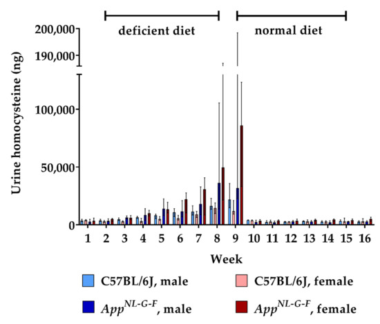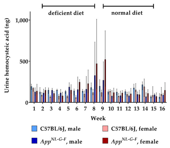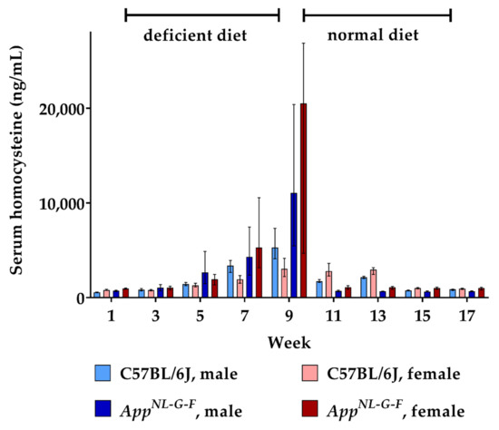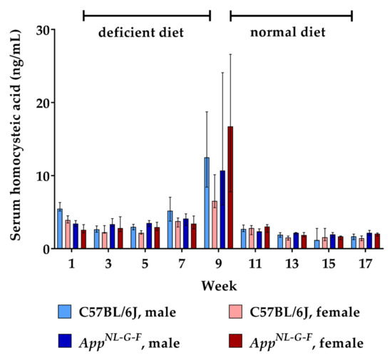 The endogenous and non-proteinogenic amino acid homocysteine (HCys) has obtained increasing attention during the last decades due to the potential contribution to versatile pathologies. It is part of the one-carbon metabolism, which physiologically enables diverse methylation reactions such as during the synthesis of nucleic acids, proteins, neurotransmitters [1]. Besides its remethylation to methionine, that is dependent on the adequate supply of vitamin B12 and folate, HCys is metabolized to cysteine in a vitamin B6-dependent manner in the transsulfuration pathway [1,2]. In contrast to its metabolization, the urinary excretion of unchanged HCys is minimal [3]. Lack of the aforementioned B-vitamins as important enzymatic cofactors causes tissues to export HCys into plasma [3]. Elevated levels of HCys in the blood are referred to as hyperhomocysteinemia. As summarized by Cohen and colleagues, hyperhomocysteinemia can arise for different reasons, including a lack of relevant B-vitamins [4]. At present, a hyperhomocysteinemic state is suggested to contribute to and exacerbate different human disorders, covering the whole range of cardiovascular diseases, cancer and neurologic disorders such as Alzheimer’s disease (AD) [1,5]; the latter is also the focus of the current study. Dementia affects more than 50 million people today [6]. Especially AD, which accounts for most dementia cases [7], still lacks appropriate medical interventions to treat or prevent the ongoing neurodegenerative processes. In the current study, a knock-in mouse model for AD was used, which simulates amyloid-β (Aβ) pathology that is one of the most prominent hallmarks of the complex disease [8,9]. Saido and colleagues generated the AppNL-G-F knock-in (KI) model and overcame problems of transgenic AD models based on massive amyloid precursor protein (APP) overexpression [10]. The disturbed Aβ metabolism in these mice results in aggressive Aβ amyloidosis and deposition in the brain from 2 months on. The early-stage plaque deposition has also been confirmed recently by others [11].