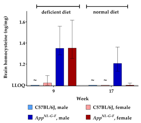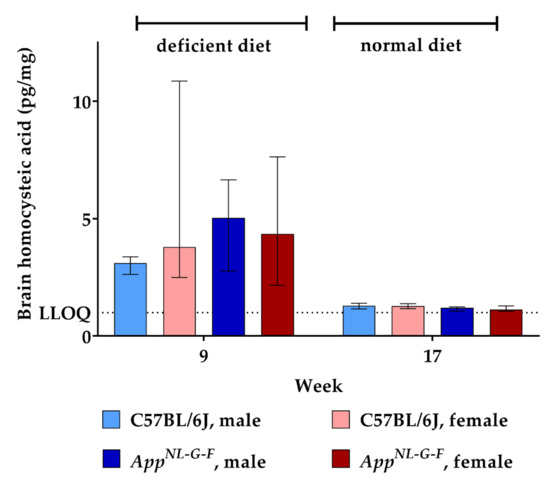Murine brains were analyzed for HCys and HCA at week 9 and week 17 of the experiment. As no animals were sacrificed at the beginning of the study, there were no cerebral baseline measurements for HCys and HCA. Data obtained after feeding control chow for eight weeks (week 17) therefore served as a control in this case. Feeding with the B-vitamin deficient diet for eight weeks resulted in higher cerebral HCys in both WT and KI mice (week 9) compared to control levels (week 17). Hyperhomocysteinemic AppNL-G-F mice displayed significantly higher levels than the C57BL/6J control (week 9; p = 0.001). There was no statistically significant sex-dependent impact on cerebral HCys at week 9. Although cerebral HCys was reduced in all groups after the control chow period (week 17), male KI mice still displayed relatively high levels compared to females and wild type mice. Results for HCys in brain tissues are presented, in part, in a descriptive manner, because all measured WT samples after eight weeks on control chow (week 17) had very low levels, below the lower limit of quantification (<LLOQ) of our LC-MS/MS method, which is 1.000 ng/mg tissue (Figure 5).