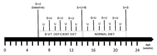 Time line of the study course, diet regimen and sampling points: S = serum sampling, U = 24-h urine sampling in metabolic cages, B = brain sampling: one half of the animals was euthanized in the middle (experimental week 9) and the other half at the end of the study (experimental week 17); feeding a diet deficient in vitamin B6, folate (B9) and B12 for 8 weeks was followed by a normal diet period for another 8 weeks.