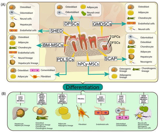 (A) Summary of dental stem cells types, sources and their multilineage differentiation capability (BM-MSCs: bone marrow mesenchymal stem cells; DPSCs: human dental pulp stem cells; SHED: human exfoliated deciduous teeth; PDLSCs: periodontal ligament stem cells; SCAP: stem cells from apical papilla; GMDSC: gingival-mesenchymal derived stem cells, hPCy- MSCs: human periapical cyst-mesenchymal stem cells). The yellow trace lines indicate stem cells origin and the arrows pinpoint their possible differentiation outcome; (B) Through specific environment conditions and different growth factors the dental stem cell types can be differentiated into other cell types (adipocytes, epithelial cells, hepatocyte, and so on).