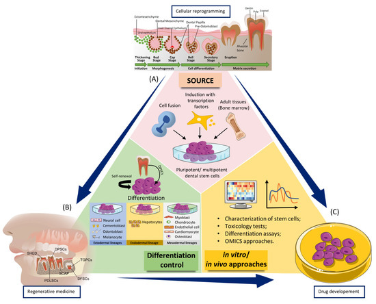 Considering the different differentiation potential of the dental stem cells, these features were exploited in regenerative dentistry for three major directions as resource for cellular reprogramming in regenerative medicine, for control the capacity to induce self-renewal or differentiation into a desired lineage [97,136], of novel testing of novel agents to determine their state or function with important implication on regenerative medicine (Figure 2).