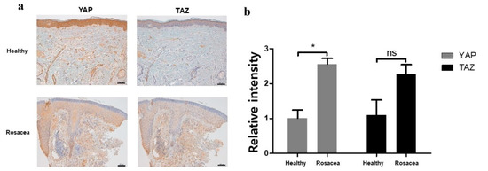 (a) Skin samples from patients with rosacea showed high levels of yes-associated protein (YAP) and transcription activator with a PDZ-binding motif (TAZ), compared with samples from healthy volunteers. Original magnification, ×200; scale bar = 100 μm. (b) Immunostaining intensities were calculated with ImageJ software. * means data was significant (p < 0.05), and ns means nonsignificant.