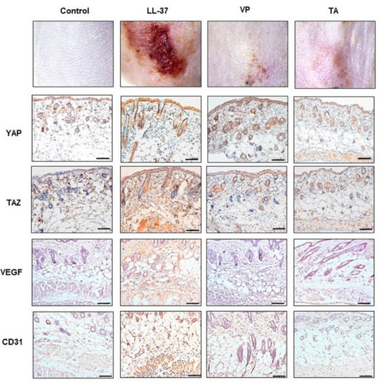 The LL-37-induced rosacea-like mouse model. Representative photomicrographs of YAP- and TAZ-, hematoxylin and eosin (H&E)-, and vascular endothelial growth factor (VEGF)-stained skin sections. Original magnification, X200; scale bar = 100 μm.