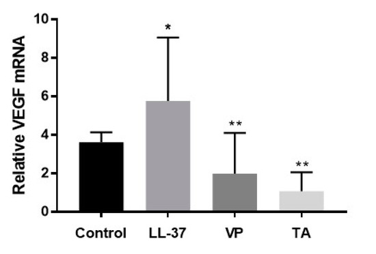 Quantitative polymerase chain reaction (qPCR) analyses of VEGF mRNA expression. Data represent the means and SEMs of three independent experiments (n = 3 for the control group and n = 5–6 for the other groups). * p < 0.05 (control group vs. LL-37 group), ** p < 0.01 (LL-37 group vs. verteporfin (VP) and triamcinolone (TA) groups) (Mann–Whitney U test).