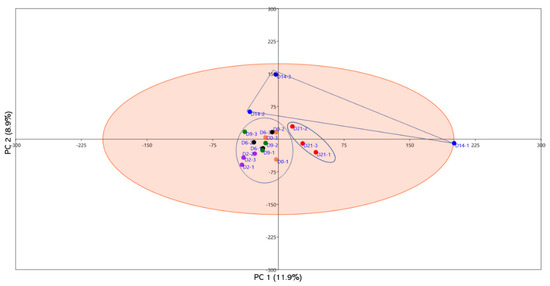 Principal component analysis (PCA) of circulatory miRNAs of blood plasma samples derived from cows subjected to bacterial infection. Samples were collected at day 0 (orange dotes) pre-infection and days 2 (purple dotes), 6 (black dotes), 9 (green dotes), 14 (dark blue dotes), and 21 (red dotes) post-infection. It is shown that the groups from days 14 (dark blue dotes) and 21 (red dotes) showed clear separation from the earlier post-infection periods. Groups are indicated by different color in biological triplicates.