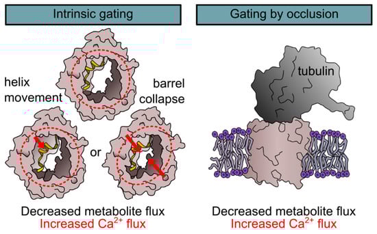 In an effort to localize the Ca2+ binding site, it was observed that the addition of an excess amount of Ca2+ prevented the blocking effect of RuR, which was reinstalled after the addition of EGTA. This suggests that ruthenium derivatives compete with Ca2+ for the same binding site []. Mutation of a glutamate residue at position 73 (E73) eliminated the blocking effect of RuR, establishing this residue as a primary candidate for the Ca2+-mediated control. However, E73 is located on the outside of the barrel facing the lipidic environment [,], and although molecular simulations predict a thinning of the nearby membrane due to the charged nature of E73 [], it remains controversial whether Ca2+ can enter the lipidic environment of the membrane. Alternatively, the mere presence of E73 could stabilize the channel in a conformation that is required for Ca2+-mediated channel regulation.