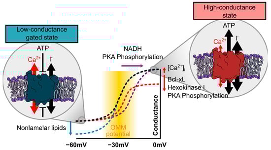 Regulation of voltage-dependent gating of VDAC. While VDAC almost exclusively resides in its anion-selective and metabolite-permeable high-conductance state at neutral potentials, it starts gating within the range of −20 to −30 mV (black line), which is well within the predicted range of an OMM potential (yellow zone). Note that the conductance–voltage relation of VDAC is symmetrical, and only the negative side is depicted. At potentials below −40 mV, it almost exclusively resides in the low-conductance state that is impermeable for ATP but shows a higher permeability of Ca2+. Several factors were reported to modulate this voltage–conductance relationship. The phosphorylation status or binding of protein partners such as Bcl-xL or hexokinase were suggested to facilitate channel gating and, thus, induce both a right-shift of the voltage dependence and a reduction in the maximum conductance at potentials close to neutral (red line), while Ca2+ is suggested to facilitate channel opening and, thus, has an opposite effect. Nonlamellar lipids were demonstrated to promote channel closure at very negative potentials (blue).