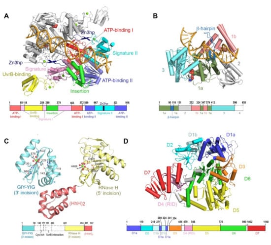 - Jaciuk, M.; Swuec, P.; Gaur, V.; Kasprzak, J.M.; Renault, L.; Dobrychłop, M.; Nirwal, S.; Bujnicki, J.M.; Costa, A.; Nowotny, M. A combined structural and biochemical approach reveals translocation and stalling of UvrB on the DNA lesion as a mechanism of damage verification in bacterial nucleotide excision repair. DNA Repair 2020, 85, 102746. [Google Scholar] [CrossRef]