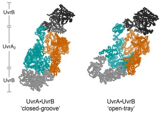 - Pakotiprapha, D.; Samuels, M.; Shen, K.; Hu, J.H.; Jeruzalmi, D. Structure and mechanism of the UvrA-UvrB DNA damage sensor. Nat. Struct. Mol. Biol. 2012, 19, 291–298. [Google Scholar] [CrossRef]