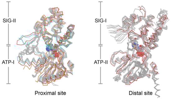 The proximal and distal nucleotide binding sites of UvrA. The nucleotide-binding domains that make up the proximal and distal nucleotide-binding sites from Protein Data Bank (PDB) entries 2R6F [], 3UX8 [], 3UWX [], 3PIH [], 3ZQJ [], 2VF7 [], 2VF8 [] and 6N9L [] were superimposed on the ATP-binding (ATP) domain. The structures are colored in gray save for 3UX8 (orange), 3PIH (red) and 6N9L (cyan) in the proximal site alignment; and 3PIH (red) in the distal site alignment. The colored structures deviate from remaining members of the group by rotation of their respective signature (SIG) domain.