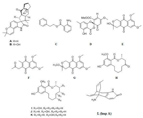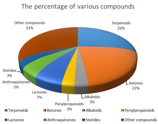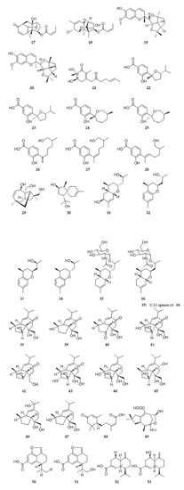 In this review, 449 new secondary metabolites, together with their chemical structures and biological activities were summarized. The structure-activity relationships and absolute configureuration of some compounds have also been described. Among all new compounds, terpenoids account for the largest proportion (75%), followed by polyketones (36%). The proportion of different types of compounds in all new compounds is shown in Figure 1. These new compounds were isolated from various fungi associated with different tissues from different plants. As a result, their structures varied a lot, which leads to their multitudinous biological activities. In addition to common antimicrobial activity and anti-tumor activity, some compounds also showed anti-enzyme activity and inhibition of biofilm formation, inhibition of phytoplankton growth, and so on.
