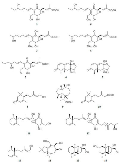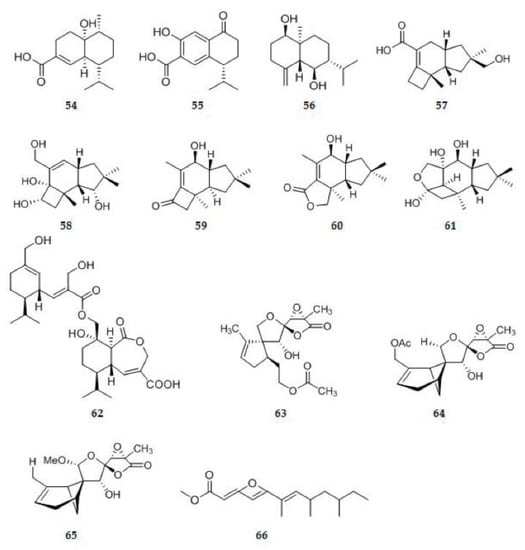 Five new polyketide-terpene hybrid metabolites 1–5 (Figure 2) with highly functionalized groups, were isolated from the endolichenic fungus Pestalotiopsis sp. [9]. Co-cultivation of mangrove endophytic fungus Trichoderma sp. 307 and aquatic pathogenic bacterium Acinetobacter johnsonii B2 led to the production of two new furan-type isoeremophilane sesquiterpenes, microsphaeropsisin B 6 and microsphaeropsisin C 7 (Figure 2). Their absolute configureuration were assigned as 4S, 5R, 7R, 8S, 11S and 4R, 5R, 7R, 8S [10]. Following cultivation on rice medium, a new sesquiterpene, atrichodermone C 8 (Figure 2), was isolated from an endophytic fungal strain named Trichoderma atroviride which was isolated from the bulb of Lycoris radiate [11]. There is an endophytic fungus Pestalotiopsis sp. which was obtained from fruits of Drepanocarpus lunatus (Fabaceae). Co-culture of this fungus with Bacillus subtilis afforded two new sesquiterpenoids pestabacillins A 9 (Figure 2) and pestabacillins B 10 (Figure 2) [12]. Two new sesquiterpene-epoxycyclohexenone conjugates, nectrianolins A 11 (Figure 2) and nectrianolins B 12 (Figure 2), together with a sesquiterpene, nectrianolin C 13 (Figure 2), were isolated from the brown rice culture of Nectria pseudotrichia 120-1NP, an endophytic fungus isolated from Gliricidia sepium. It is of particular interest that 11 and 12 have a rearranged monocyclofarnesyl skeleton (which is uncommon to sesquiterpene-epoxycyclohexane conjugates) instead of a bicyclofarnesyl skeleton which is present in macrophorins, neomacrophorins, myrothecols, and craterellins [13]. It was found that endophytic Nigrospora oryzae stimulated the production of a new tremulane sesquiterpene nigrosirpexin A 14 (Figure 2) from Irpex lacteus [14]. Two novel sesquiterpenoids with an unprecedented tricyclo[4,4,2,1]hendecane scaffold, namely emericellins A 15 (Figure 2) and emericellins B 16 (Figure 2) representing a new skeleton, were isolated from the liquid cultures of an endophytic fungus Emericella sp. XL 029 associated with the leaves of Panax notoginseng [15]. Two trichothecene sesquiterpenoids, trichothecrotocins A 17 (Figure 2) and trichothecrotocins B 18 (Figure 2), and a pair of merosesquiterpenoid racemates, (+)-trichothecrotocin C 19 (Figure 2) and (−)-trichothecrotocin C 20 (Figure 2), were obtained from potato endophytic fungus Trichothecium crotocinigenum by bioguided isolation. Compounds 17 and 18 are trichothecenes possessing new ring systems. Compounds 19 and 20 possess novel 6/6−5/5/5 fused ring system [16]. Chemical investigation on the solid rice culture of Trichoderma atroviride S361, an endophyte isolated from Cephalotaxus fortunei, has afforded a new cyclohexenone sesquiterpenoid, trichodermadione B 21 (Figure 2) [17]. Seven new phenolic bisabolane sesquiterpenoids, (7R,10S)-7,10-epoxysydonic acid 22 (Figure 2), (7S,10S)-7,10-epoxysydonic acid 23 (Figure 2), (7R,11S)-7,12-epoxysydonic acid 24 (Figure 2), (7S,11S)-7,12-epoxysydonic acid 25 (Figure 2), 7-deoxy-7,14-didehydro-12-hydroxysydonic acid 26 (Figure 2), (Z)-7-deoxy-7,8-didehydro-12-hydroxysydonic acid 27 (Figure 2), and (E)-7-deoxy-7,8-didehydro-12-hydroxysydonic acid 28 (Figure 2), were obtained from the culture of an endophytic fungus Aspergillus sp. xy02 isolated from the leaves of a Thai mangrove Xylocarpus moluccensis [18]. Pestalustaines A 29 (Figure 2), one unique sesquiterpene possessing an unusual 5/6/7-fused tricyclic ring system was isolated from the plant-derived Pestalotiopsis adusta [19]. A new acorane sesquiterpene, 3β-hydroxy-β-acorenol 30 (Figure 2), possesses an acorane framework was separated from the extract of the green Chinese onion derived fungus Fusarium proliferatum AF-04 [20]. An examination of the endophytic fungus Trichoderma asperellum A-YMD-9-2 obtained from the marine red alga Gracilaria verrucosa led to the isolation of seven new chromanoid norbisabolane derivatives, trichobisabolins I–L 31–34 (Figure 2) and trichaspsides C–E 35–37 (Figure 2). The discovery of compounds 31–37 greatly diversifies the structures of norbisabolane sesquiterpenes [21]. Oxytropiols A–J 38–47 (Figure 2), ten undescribed highly oxygenated guaiane-type sesquiterpenoids, were isolated from the locoweed endophytic fungus Alternaria oxytropis [22]. Studies on the bioactive extract of mangrove endophytic fungus Pleosporales sp. SK7 led to the isolation of an abscisic acid-type sesquiterpene 48 (Figure 2), named (10S, 2Z)-3-methyl-5-(2,6,6-trimethyl-4-oxocyclohex-2-enyl)pent-2-enoicacid [23]. One new tremulane sesquiterpene, irpexlacte A 49 (Figure 2), was isolated from the endophytic fungus Irpex lacteus DR10-1 waterlogging tolerant plant Distylium chinense [24]. Trichocadinins B−G 50–55 (Figure 2), six new cadinane-type sesquiterpene derivatives, each with C-14 carboxyl functionality, were isolated from the culture extract of Trichoderma virens QA-8, an endophytic fungus obtained from the fresh inner tissue of the medicinal plant Artemisia argyi [25]. Chemical investigation of the EtOAc extract of the plant-associated fungus Alternaria alternate in rice culture led to the isolation of a new sesquiterpene (1R,5R,6R,7R,10S)-1,6-Dihroxyeudesm-4(15)-ene 56 (Figure 2) [26]. An investigation of a co-culture of the Armillaria sp. and endophytic fungus Epicoccum sp. YUD17002 associated with Gastrodia elata led to the isolation of five protoilludane-type sesquiterpenes named epicoterpenes A–E 57–61 (Figure 2). Compound 60 was the first example of an ent-protoilludane sesquiterpenoid scaffold bearing a five-membered lactone. Notably, none of the new compounds were produced by either of the two fungi when cultured alone under the same conditions [27]. A new sesquiterpene lactone, namely colletotrin 62 (Figure 2), was obtained from a rice culture of Colletotrichum gloeosporioides, an endophytic fungus isolated from the stem bark of Cameroonian medicinal plant Trichilia monadelpha (Meliaceae) [28]. Purp