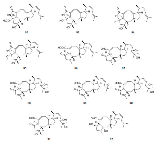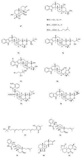 One new cleistanthane-type diterpene zythiostromic acid C 67 (Figure 3), which structure was assigned as 3α,5α,7β,8β-tetrahydroxycleistanth-13(17),15-dien-18-oic acid, was isolated from the brown rice culture of Nectria pseudotrichia 120-1NP [31]. A fungal strain, Drechmeria sp., was isolated from the root of Panax notoginseng. Totally, seven new indole diterpenoids, drechmerins A–G 68–74 (Figure 3), were isolated from the fermentation broth of Drechmeria sp. [32]. A novel 1(2), 2(18)-diseco indole diterpenoid, drechmerin H 75 (Figure 3), was isolated from the fermentation broth of Drechmeria sp. together with a new indole diterpenoid, 2′-epi terpendole A 76 (Figure 3) [33]. An endophytic fungus, Neosartorya fifischeri JS0553, was isolated from G. littoralis plant. From the fungus, a new meroditerpenoid named sartorypyrone E 77 (Figure 3) was isolated [34]. Two new oxoindolo diterpene epimers, anthcolorin G 78 (Figure 3) and anthcolorin H 79 (Figure 3), isolated for the first time from a natural source, were isolated from the solid rice culture of the endophytic fungus Aspergillus versicolor [35]. A new isopimarane derivative which was named as xylaroisopimaranin A 80 (Figure 3) and the absolute configureurations was determined as 4S, 5R, 9R, 10R, 13R and 14S, was isolated from the plant endophytic fungus Xylaralyce sp. (HM-1) [36]. The endolichenic fungus Apiospora montagnei isolated from the lichen Cladonia sp. was cultured on solid rice medium, yielding a new diterpenoid libertellenone L 81 (Figure 3), compound 81 represented the first example of 6,7-seco-libertellenone derivative [37].