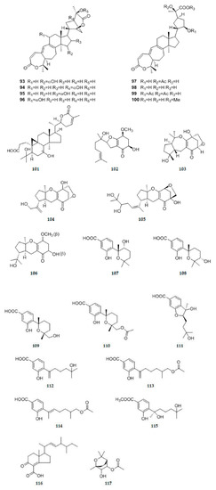 Eleven new ophiobolin-type sesterterpenoids, asperophiobolins A−K 82–92 (Figure 4), were isolated from the cultures of the mangrove endophytic fungus Aspergillus sp. ZJ-68. Asperophiobolins A–D (82−85) represented the first examples possessing a five-membered lactam unit between C-5 and C-21 in ophiobolin derivatives. The absolute configureuration of compands were defined as (2S,3R,5S,6R,11R,14R,15S) (82–84), (2S,3R,5S,6R,10S,11R,14R,15S) (85), (2S,6S,10S,11R,14R,15S,18R) (87), (2S,6R,10S,11R,14R,15S,18R) (88), (2S,6S,10S,11R,14R,15S,18S) (89), (2S,6R,10S,11R,14R,15S,18S) (90),(2S,3R,6R,10S,11R,14R,15S,18S) (91), (2R,3R,5R,6R,10S,11R,14R,15S) (92) [38]. From Kadsura angustifolia fermented by an associated symbiotic endophytic fungus, Penicillium sp. SWUKD4.1850, nine undescribed triterpenoids, kadhenrischinins A–H 93–100 (Figure 4), and 7β-schinalactone C 101 (Figure 4) were isolated and established. All these metabolites have been first detected in non-fermented K. angustifolia. Structurally, kadhenrischinins A–D (93–96) belong to the relatively rare class of highly oxygenated schitriterpenoids that contain a unique 3-one-2-oxabicyclo [3,2,1]-octane motif, while kadhenrischinins E–H (97–100) feature acyclopentane ring in a side chain rarely found in the family Schisandraceae [39]. Meroterpenoids with diverse ring systems including five new ones (102–106) (Figure 4), were isolated from Phyllosticta capitalensis, an endophytic fungus from Cephalotaxus fortunei Hook. Compound 102 was the first example with a 9,14-seco ring and a five-membered ring in guignardone derivatives. Compound 103 represented a novel guignardone derivative possessing a 5/7/6/5 ring system with CH2-7 attached to C-4 rather than C-6 in ring D [40]. Nine new meroterpenes, (7R,8R)-8-hydroxysydowic acid 107 (Figure 4), (7S,10S)-10-hydroxy-sydowic acid 108 (Figure 4), (7S,11R)-12-hydroxy-sydowic acid 109 (Figure 4), (7S,11R)-12-acetoxy-sydowic acid 110 (Figure 4), (7R,8R)-1,8-epoxy-11-hydroxy-sydonic acid 111 (Figure 4), 7-deoxy-7,14-didehydro-11-hydroxysydonic acid 112 (Figure 4), 7-deoxy-7,14-didehydro-12-acetoxy-sydonic acid 113 (Figure 4), and (E)-7-deoxy-7,8-didehydro-12-acetoxy-sydonic acid 114 (Figure 4), (7R)-11-hydroxy-sydonic acid methyl ester 115 (Figure 4), were isolated from the solid rice culture of the endophytic fungus Aspergillus versicolor [35]. Bioassay-guided fractionation of the crude extract of fermentation broth of one symbiotic strain Fusarium oxysporum ZZP-R1 derived from coastal plant Rumex madaio Makino, one traditional Chinese medicine used as a treatment of inflammation and toxication, yielded one novel compound, fusariumins C 116 (Figure 4). Chemical structure of 116 was determined as one meroterpene with cyclohexanone moiety [30]. A new monoterpentoid lithocarin D 117, was isolated from the endophytic fungus Diaporthe lithocarpus A740 (Figure 4) [41].