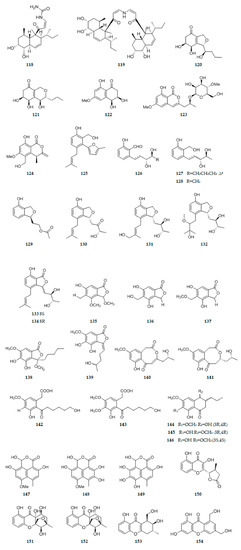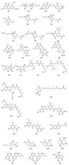 An endophytic fungus, Eupenicillium sp. LG41, isolated from the Chinese medicinal plant Xanthium sibiricum, was subjected to epigenetic modulation using an NAD+-dependent histone deacetylase (HDAC) inhibitor, nicotinamide. Epigenetic stimulation of the endophyte led to enhanced production of two new decalin-derived polyketides with a double bond between C-3 and C-4, eupenicinicols C 118 (Figure 5) and D 119 (Figure 5) [42]. On the basis of One Strain/Many Compounds (OSMAC) strategy, five new polyketides, named phomopsiketones A–C 120–122 (Figure 5), (10S)-10-O-b-D-40-methoxymannopyranosyldiaporthin 123 (Figure 5), and clearanol 124 (Figure 5), were isolated from an endophytic fungus, Phomopsis sp. sh917, harbored in stems of Isodon eriocalyx var. laxiflora [43]. As naturally occurring polyketides, ten new salicyloid derivatives, namely vaccinols J–S 125–134 (Figure 5), were isolated from Pestalotiopsis vaccinii (cgmcc3.9199) endogenous with the mangrove plant Kandelia candel (L.) Druce (Rhizophoraceae) [44]. Twelve new polyketides, penicichrysogenins A–L 135–146 (Figure 5), were isolated from the solid substrate fermentation cultures of a Huperzia serrata endophytic fungus Penicillium chrysogenum MT-12. The structures of 135–139 were established as (2R)-6-hydroxy-2,4-dimethoxy-5-methylphthalide (135), 4,6-dihydroxy-5-hydroxymethylphthalide9 (136), 4,6-dihydroxy-5-methoxymethylphthalide (137), (2R)-4,5-dihydroxy-2,6-dimethoxy-2-pentylphthalide (138), (E)-4,5-dihydroxy-2-(4-hydroxypentylidene)-6-methoxyphthalide(139), respectively [45]. Three new polyketides, cylindrocarpones A–C 147–149 (Figure 5), were isolated from the endophytic fungus, Cylindrocarpon sp., obtained from the tropical plant Sapium ellipticum [46]. Six new xanthone-derived polyketides, named phomoxanthones F–K 150–155 (Figure 5), were isolated from Phomopsis sp. xy21, which was isolated as an endophytic fungus from the Thai mangrove Xylocarpus granatum. Phomoxanthone F 150 represented the first xanthone-derived polyketide containing a 10a-decarboxylated benzopyranone nucleus that was substituted by a 4-methyldihydrofuran-2(3H)-one moiety at C10a. Phomoxanthones G 151 and H 152 are highly oxidized xanthone-derived polyketides containing a novel 5-methyl-6-oxabicyclo [3.2.1] octane motif [47]. Compound 156 (Figure 5), 5,9-dihydroxy-2,4,6,8,10-pentamethyldodeca-2,6,10-trienal, a novel polyketide molecule was isolated from Aspergillus flocculus endophyte isolated from the stem of the medicinal plant Markhamia platycalyx [48]. Three new polyketides, (2S)-2,3-dihydro-5,6-dihydroxy-2-methyl-4H-1-benzopyran-4-one 157 (Figure 5), (2′R)-2-(2′-hydroxypropyl)-4-methoxyl-1,3-benzenediol 158 (Figure 5), and 4-ethyl-3-hydroxy-6-propenyl-2H-pyran-2-one 159 (Figure 5) were isolated from the culture broth of Colletotrichum gloeosporioides, an endophytic fungus derived from the mangrove Ceriops tagal [49]. Five polyketides, paralactonic acids A–E 160–164 (Figure 5) were isolated from Paraconiothyrium sp. SW-B-1, an endophytic fungus isolated from the seaweed, Chondrus ocellatus Holmes [50]. Four new polyketides, alternatains A–D 165–168 (Figure 5), were obtained from the solid substrate fermentation cultures of Alternaria alternata MT-47, an endophytic fungus isolated from the medicinal plant of Huperzia serrata [51]. From extracts of the plant associated fungus Chaetosphaeronema achilleae collected in Iran, two polyketides including a previously unreported isoindolinone named chaetosisoindolinone 169 (Figure 5) and a previously undescribed indanone named chaetosindanone 170 (Figure 5) were isolated [52]. During a survey of the secondary metabolites of endophytic fungi Aspergillus porosus, new polyketides with interesting structural features named porosuphenols A–D 171–174 (Figure 5) were found [53]. Chemical investigation of the EtOAc extract of the plant-associated fungus Alternaria alternate in rice culture led to the isolation of a novel liphatic polyketone, alternin A 175 (Figure 5), which possesses an unprecedented C25 liphatic polyketone skeleton [26]. Five new polyketides, colletotric B 176 (Figure 5), 3-hydroxy-5-methoxy-2,4,6-trimethylbenzoic acid 177 (Figure 5), colletotric C 178 (Figure 5), chaetochromone D 179 (Figure 5) and 8-hydroxy-pregaliellalactone B 180 (Figure 5), were isolated from thmangrove endophytic fungus Phoma sp. SYSU-SK-7 [54]. The EtOAc extract of Phomopsis sp. D15a2a isolated from the plant Alternanthera bettzickiana following fermentation on solid rice medium yielded three new polyketides, phomopones A−C 181–183 (Figure 5) [55]. Three new polyketides including two benzophenone derivatives, penibenzones A (184) and B (185) (Figure 5), and a new phthalide derivative, penibenzone C 186 (Figure 5), were isolated from the solid-substrate cultures of the endophytic fungus Penicillium purpurogenum IMM003 [56].