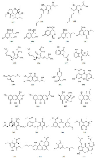 A new N-methoxypyridone analog 11S-hydroxy-14-methyl cordypyridone C 187 (Figure 6), was isolated from the co-culture of Hawaiian endophytic fungi Camporesia sambuci FT1061 and Epicoccum sorghinum FT1062 [57]. A novel endophyte Rhytismataceae sp. DAOMC 251461 produced two new dihydropyrones: (R)-4-hydroxy-5-octanoyl-6-oxo-3,6-dihydropyran-2-carboxylic acid (rhytismatone A) 188 (Figure 6) and (R)-methyl-4-hydroxy-5-octanoyl-6-oxo-3,6-dihydropyran-2-carboxylate (rhytismatone B) 189 (Figure 6) [58]. Five new bioactive 2-pyrone metabolites, phomaspyrones A–E 190–194 (Figure 6), were isolated from the culture broth of an endophytic fungus Phomopsis asparagi SWUKJ5.2020 of medicinal plant Kadsura angustifolia. The structures of 190–194 were identified as (S)-5-(1,2-dihydroxyethyl)-6-hydroxymethyl-4-methoxy-2H-pyran-2-one (190),(S)-5-(1-hydroxyethyl)-6-hydroxymethyl-4-methoxy-2H-pyran-2-one (191), (5S,8R)-5,8-dihydroxy-4-methoxy-5,6-dihydropyrano-[3,4-b]pyran-2(8H)-one (192), 4-methoxy-6-methyl-5-(2-oxobutyl)-2H-pyran-2-one (193), 6-(hydroxymethyl)-4-methoxy-5-(2-oxobutyl)-2H-pyran-2-one (194) respectively [59]. Extracts from an endophytic fungus Dendrothyrium variisporum isolated from the roots of the Algerian plant Globularia alypum produced two new minor furanone derivatives: methyl (5S)-5-[(10E,30Z)-hexa-1,3-dienyl]-5-methyl-4-oxo-2-methyl-4,5-dihydrofuran-3 carboxylate ((5S) cis-gregatin B) 195 (Figure 6), (5R)-5-[(10E,30Z)-hexa-1,3-dienyl]-5-methyl-4-oxo-2-[(4S,1E)-4-hydroxypent-1-enyl]-4,5-dihydrofuran-3carboxylate, (graminin D) 196 (Figure 6) [60]. Two new compounds isobenzofuranone A 197 (Figure 6) and indandione B 198 (Figure 6), were isolated from liquid cultures of an endophytic fungus Alternaria sp., which was obtained from the medicinal plant Morinda officinalis. Among them, the indandione 198 showed a rarely occurring indanone skeleton in natural products [61]. An endophytic fungal strain named Trichoderma atroviride was isolated from the bulb of Lycoris radiata. Following cultivation on rice medium, a new cyclopentenone derivative, atrichodermone B 199 (Figure 6), was isolated [11]. One previously undescribed isochromone derivative 6,8-dihydroxy-3-(2-hydroxypropyl)-7-methyl-1H-isochromen-1-one 200 (Figure 6), was isolated from the culture of the endophytic fungus Eurotium chevalieri KUFA 0006 [62]. One previously undescribed pyrone (simplicilopyrone) 201 (Figure 6) was isolated from the endophytic fungus Simplicillium sp. PSU-H41 [63]. Cytosporaphenones A–C, one new polyhydric benzophenone 202 (Figure 6) and two new naphtopyrone derivatives 203–204 (Figure 6), were isolated from Cytospora rhizophorae, an endophytic fungus from Morinda officinalis [64]. A novel pyrone derivative 205 (Figure 6) bearing two fused five-member rings, together with two new naphthalenone derivatives 206–207 (Figure 6), were obtained from the endophytic fungus Fusarium sp. HP-2, which was isolated from “Qi-Nan” agarwood [65]. Two new compounds penibenzophenones A-B 208–209 (Figure 6), were isolated from the EtOAc extract of the endophytic fungus Penicillium citrinum HL-5126 isolated from the mangrove Bruguiera sexangula var. rhynchopetala collected in the South China Sea [66]. Two new isochromanone derivatives, (3S,4S)-3,8-dihydroxy-6-methoxy-3,4,5-trimethylisochroman-1-one 210 (Figure 6) and methyl (S)-8-hydroxy-6-methoxy-5-methyl-4a-(3-oxobutan-2-yl)benzoate 211 (Figure 6), were isolated from the cultures of an endophytic fungus Phoma sp. PF2 obtained from Artemisia princeps [67]. Isoshamixanthone 212 (Figure 6), a new stereoisomeric pyrano xanthone was obtained from the endophytic fungal strain Aspergillus sp. ASCLA isolated from leaf tissues of the medicinal plant Callistemon subulatus [68]. From the endophytic fungus, Cylindrocarpon sp., obtained from the tropical plant Sapium ellipticum, a new pyrone cylindropyrone 213 (Figure 6) was isolated [46]. One new benzophenone derivative, named tenllone I 214 (Figure 6), was isolated from the endophytic fungus Diaporthe lithocarpus A740 [41].