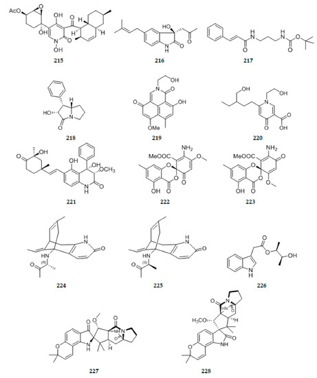 The endolichenic fungus Apiospora montagnei isolated from the lichen Cladonia sp. was cultured on solid rice medium, yielding a new pyridine alkaloid, 23-O-acetyl-N-hydroxyapiosporamide 215 (Figure 7) [37]. Chaetoindolin A 216 (Figure 7), a new indole alkaloid derivative was isolated from the endophytic fungus Chaetomium globosum CDW7 [69]. A synthetic α,β-unsaturated amide alkaloid (E)-tert-butyl(3-cinnamamidopropyl) carbamate 217 (Figure 7), newly identified as a natural product, was isolated from the EtOAc extract of the endophytic fungus Penicillium citrinum HL-5126 isolated from the mangrove Bruguiera sexangula var. Rhynchopetala [66]. A new alkaloid, 1, 2-dihydrophenopyrrozin 218 (Figure 7), was isolated from an axenic culture of the endophytic fungus, Bionectria sp., obtained from seeds of the tropical plant Raphia taedigera [70]. Two new pyridone alkaloids, cylindrocarpyridones A–B 219–220 (Figure 7), were isolated from the endophytic fungus, Cylindrocarpon sp., obtained from the tropical plant Sapium ellipticum [46]. From Aspergillus versicolor, an endophyte derived from leaves of the Egyptian water hyacinth Eichhornia crassipes (Pontederiaceae), one new compound aflaquinolone H 221 (Figure 7) belonging to dihydroquinolone alkaoids was obtained [71]. Two new spiroketal derivatives as alkaloids with an unprecedented amino group, 2′-aminodechloromaldoxin 222 (Figure 7) and 2′-aminodechlorogeodoxin 223 (Figure 7), were isolated from the plant endophytic fungus Pestalotiopsis flavidula [72]. The biotransformation of lycopodium alkaloid huperzine A (hupA), one of the characteristic bioactive constituents of the medicinal plant Huperzia serrata, by a fungal endophyte of the host plant was studied. Two previously undescribed compounds 224–225 (Figure 7), were isolated and identified [73]. Chemical investigation of the EtOAc extract of the plant-associated fungus Alternaria alternate in rice culture led to the isolation of a new indole alkaloid 226 (Figure 7) [26]. Bioactivity-guided isolation of the endophytic fungus Fusarium sambucinum TE-6L residing in Nicotiana tabacum L. led to the discovery of two new angularly prenylated indole alkaloids (PIAs) with pyrano[2,3-g]indole moieties, amoenamide C 227 (Figure 7) and sclerotiamide B 228 (Figure 7). Compound 227 containing the 8 bicyclo[2.2.2]diazaoctane core and indoxyl unit was rarely reported [74].