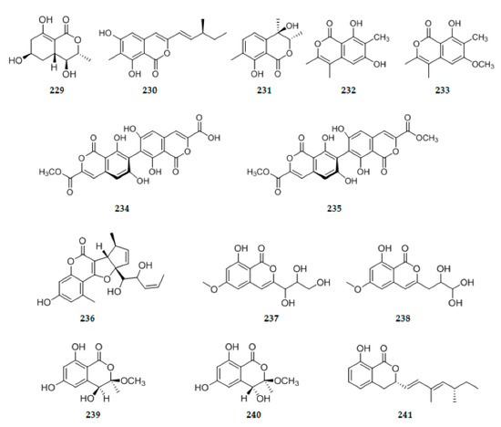 A new isocoumarin (3R,4S,4aR,6R)-4,6,8-trihydroxy-3-methyl-3,4,4a,5,6,7-hexahydroisochromen-1-one 229 (Figure 8) was isolated from an endophyte Mycosphaerellaceae sp. DAOMC 250863 [58]. Using the bioassay-guided method, one new isocoumarin derivative, prochaetoviridin A 230 (Figure 8), was isolated from C. globosum CDW7, an endophyte from Ginkgo biloba [66]. A new isocoumarin derivative pestalotiopisorin B 231 (Figure 8), was isolated from Pestalotiopsis sp. HHL-101, an endophytic fungus obtained from Chinese mangrove plant Rhizophora stylosa [75]. In continuing search of fungal strain Nectria pseudotrichia 120-1NP, two new isocoumarins, namely, nectriapyrones A 232 (Figure 8) and B 233 (Figure 8) were identified [31]. Two new isocoumarin dimers 234–235 (Figure 8) were isolated from Aspergillus versicolor, an endophyte derived from leaves of the Egyptian water hyacinth Eichhornia crassipes (Pontederiaceae) [71]. Pestalustaines 236 (Figure 8), one unprecedented coumarin derivative bearing 6/6/5/5-fused tetracyclic ring system, was isolated from a plant-derived endophytic fungus Pestalotiopsis adusta [19]. Compounds 237 (Figure 8) and 238 (Figure 8), determined as two novel isocoumarin derivatives with a different butanetriol group at C-3, were produced by T. harzianum (Trichoderma harzianum) Fes1712 isolated from Rubber Tree Ficus elastica leaves [76]. Two pairs of new isocoumarin derivatives penicoffrazins B and C, 239–240 (Figure 8), were isolated from Penicillium coffeae MA-314, an endophytic fungus obtained from the fresh inner tissue of the leaf of marine mangrove plant Laguncularia racemosa [77]. A new dihydroisocoumarin, diaporone A 241 (Figure 8), was isolated from the ethyl acetate extract of the cultures of the endophytic fungus Diaporthe sp. [78].