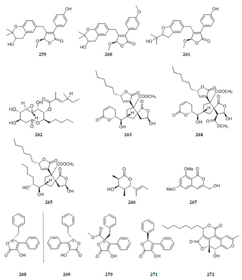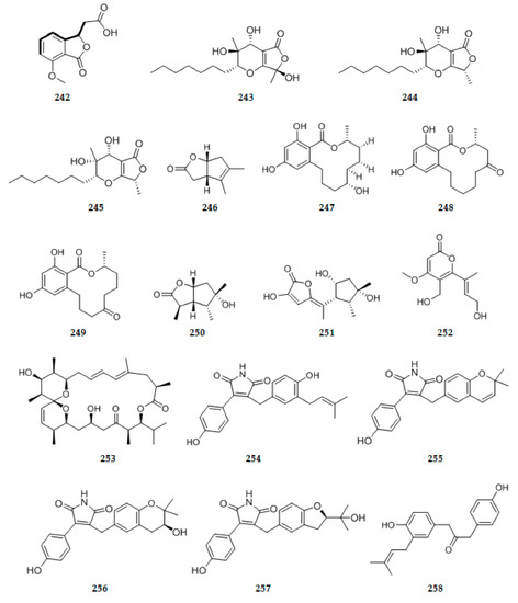 From the seeds of the traditional medicinal plant Ziziphus jujuba growing in Uzbekistan, the fungal endophyte Alternaria sp. was isolated. Extracts of this fungus yielded a new natural phthalide derivative 7-methoxyphthalide-3-acetic acid 242 (Figure 9) [79]. Three new lactone Derivatives isoaigialones, A, B, and C 243–245 (Figure 9), were isolated from the crude EtOAc extract of a Phaeoacremonium sp., an endophytic fungus obtained from the leaves of Senna spectabilis. 245 is epimeric at C-7 relative to compound 244 [80]. A new phytotoxic bicyclic lactone (3aS,6aR)-4,5-dimethyl-3,3a,6,6a-tetrahydro-2H-cyclopenta [b]furan-2-one 246 (Figure 9), was isolated from the ethyl acetate extract of fermentation broth of Xylaria curta 92092022 [81]. Three new lactones de-O-methyllasiodiplodins, (3R,7R)-7-hydroxy-de-O-methyllasiodiplodin 247 (Figure 9) and (3R)-5-oxo-deO-methyllasiodiplodin 248 (Figure 9), together with (3R)-7-oxo-de-O-methyllasiodiplodin 249 (Figure 9) were isolated from the co-cultivation of mangrove endophytic fungus Trichoderma sp. 307 and aquatic pathogenic bacterium Acinetobacter johnsonii B2 [10]. Two new lactones, pestalotiolactones A 250 (Figure 9) and B 251 (Figure 9), were isolated from the axenic culture of the endophytic fungus Pestalotiopsis sp., obtained from fruits of Drepanocarpus lunatus (Fabaceae) [12]. Active metabolites investigation of Talaromyces sp. (strain no. MH551540) associated with Xanthoparmelia angustiphylla afforded a new 3-methoxy-4,8-bihydroxymethyl-6-methyl-2,4,6-3en-δ-lactone, talaromycin A 252 (Figure 9) [82]. Introducing an alien carbamoyltransferase (asm21) gene into the Streptomyces sp. CS by conjugal transfer, as a result, one recombinatorial mutant named CS/asm21-4 was successfully constructed. From the extracts of the CS/asm21-4 cultured on oatmeal solid medium, a new macrolide hookerolide 253 (Figure 9) was obtained [83]. Four new aromatic butenolides, asperimides A–D 254–257 (Figure 9), were isolated from solid cultures of a tropical endophytic fungus Aspergillus terreus. Compounds 254–257 represent the first examples of butenolides with a maleimide core isolated from Aspergillus sp. [84]. In ongoing search for bioactive metabolites from the genus of Aspergillus, four new butenolides, namely terrusnolides A–D 258–261 (Figure 9) were isolated from an endophytic Aspergillus from Tripterygium wilfordii. Compound 258 was a butenolide derived by a triple decarboxylation. Furthermore, compounds 259–261 were the 4-benzyl-3-phenyl-5H-furan-2-one derivatives with an isopentene group fused to the benzene ring [85]. Chemical investigation on the culture extract of H. fuscum fermented on rice led to the isolation of one new 10-membered lactone 5,6-Epoxy-phomol 262 (Figure 9) [86]. Three new spirocyclic anhydride derivatives 263–265 (Figure 9) were isolated from the endophytic fungus Talaromyces purpurogenus obtained from fresh leaves of the toxic medicinal plant Tylophora ovate [87]. A new δ-lactone penicoffeazine A, 266 (Figure 9) was isolated from Penicillium coffeae MA-314, an endophytic fungus obtained from the fresh inner tissue of the leaf of marine mangrove plant Laguncularia racemosa [77]. On the basis of One Strain/Many Compounds (OSMAC) strategy, a new natural product 267 (Figure 9), was isolated from an endophytic fungus, Phomopsis sp. sh917, harbored in stems of Isodon eriocalyx var. laxiflora [43]. A chemical investigation on metabolites of Phyllosticta sp. J13-2-12Y isolated from the leaves of Acorus tatarinowii was carried out, which led to the isolation of four new phenylisotertronic acids, R-xenofuranone B 268 (Figure 9), S-xenofuranone B 269 (Figure 9), enantio-flflavipesin B 270 (Figure 9), and S-3-hydroxy-4,5-diphenylfuran-2(5H)-one 271 (Figure 9) [88]. An endophytic fungus Pestalotiopsis microspora isolated from the fruits of Manilkara zapota was cultured in potato dextrose broth media. Chromatographic separation of the EtOAc extract of the broth and mycelium led to the isolation of a new azaphilonoid named pitholide E 272 (Figure 9) [89].