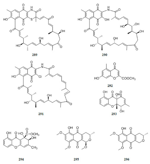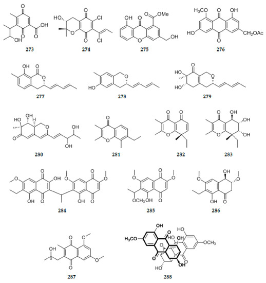An endophytic fungus Penicillium citrinum Salicorn 46 isolated from Salicornia herbacea Torr., Produced one new citrinin derivative, pencitrinol 273 (Figure 10) [90]. Lachnum cf. pygmaeum DAOMC 250335 was obtained from ascospores originating from a collection of apothecia occurring on a dead P. rubens twig, from this strain, a new chlorinated para-quinone, chloromycorrhizinone A 274 (Figure 10) was isolated [58]. The endolichenic fungus Apiospora montagnei isolated from the lichen Cladonia sp. was cultured on solid rice medium, yielding a new xanthone derivative 8-hydroxy-3-hydroxymethyl-9-oxo-9Hxanthene-1-carboxylic acid methyl ether 275 (Figure 10) [37]. One previously undescribed metabolite anthraquinone derivative acetylquestinol 276 (Figure 10), was isolated from the culture of the endophytic fungus Eurotium chevalieri KUFA 0006 [62]. New pulvilloric acid-type azaphilones 277–280 (Figure 10) were produced by Nigrospora oryzae co-cultured with Irpex lacteus [14]. A new shunt product spiciferone F 281 (Figure 10) together with two new analogs spiciferones G 282 (Figure 10) and H 283 (Figure 10) were isolated from endophytic fungus Phoma betae inhabiting in plant Kalidium foliatum (Pall.) [91]. Bioassay-guided fractionation of the dichloromethane extract of the fungus Neofusicoccum austral SYSU-SKS024 led to the isolation of three new ethylnaphthoquinone derivatives, neofusnaphthoquinone A 284 (Figure 10), 6-(1-methoxylethy1)-2,7-dimethoxyjuglone 285 (Figure 10), (3R,4R)-3-methoxyl-botryosphaerone D 286 (Figure 10), Neofusnaphthoquinone A 285 is the third example of the unsymmetrical naphthoquinone [92]. The EtOAc extract of strain Nectria pseudotrichia 120-1NP led to the identification of one new naphthoquinone, namely, nectriaquinone B 287 (Figure 10) [31]. Cytoskyrin C 288 (Figure 10), a new bisanthraquinone with asymmetrically cytoskyrin type skeleton, was isolated from an endophytic fungus ARL-09 (Diaporthe sp.) from Anoectochilus roxburghii [93]. Three new naphthomycins O–Q 289–291 (Figure 10), were obtained from the solid cultured medium of recombinatorial mutant strain CS/asm21-4 (By introducing an alien carbamoyltransferase (asm21) gene into the strain Streptomyces sp. CS (CS) by conjugal transfer) [83]. From the fermentation broth of the endophytic fungus Xylaria sp.SYPF 8246, one new compound, xylarianins B 292 (Figure 10) was isolated [94]. An undescribed substituted dihydroxanthene-1,9-dione, named funiculosone 293 (Figure 10), was isolated together from the culture filtrates of Talaromyces funiculosus (Thom) Samson, Yilmaz, Frisvad & Seifert (Trichocomaceae), an endolichenic fungus isolated from lichen thallus of Diorygma hieroglyphicum (Pers.) Staiger & Kalb (Graphidaceae), in India [95]. One new dihydroxanthenone derivative globosuxanthone E 294 (Figure 10) was obtained from the crude extracts of two endophytic fungi Simplicillium lanosoniveum (J.F.H. Beyma) Zare & W. Gams (Sarocladium strictum) PSU-H168 and PSU-H261 which were isolated from the leaves of Hevea brasiliensis [96]. Two new naphthoquinone derivatives, 6-hydroxy-astropaquinone B 295 (Figure 10) and astropaquinone D 296 (Figure 10) were isolated from Fusarium napiforme, an endophytic fungus isolated from the mangrove plant, Rhizophora mucronata [97].