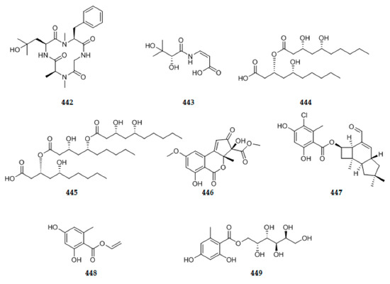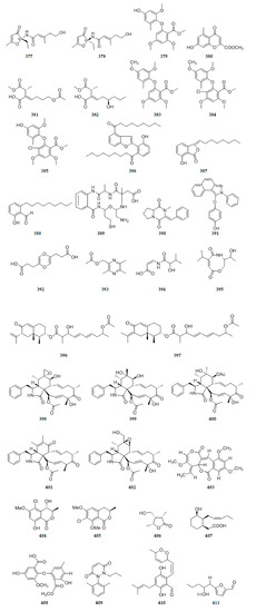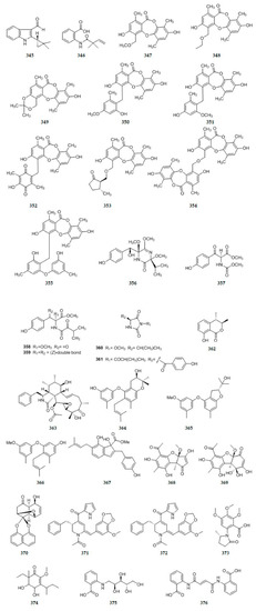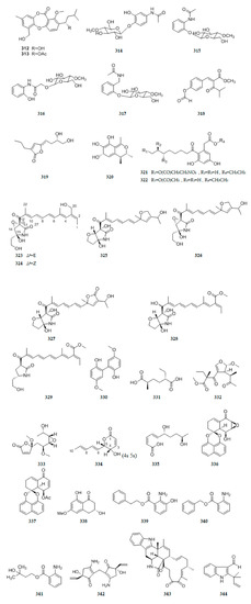 An endophytic fungus Talaromyces stipitatus SK-4 was isolated from the leaves of a mangrove plant Acanthus ilicifolius. Its crude extract exhibited significant antibacterial activity was purified to afford two new depsidones, talaromyones A and B 312–313 (Figure 12) [104]. Four new amide derivatives, designated as cordycepiamides A–D 314–317 (Figure 12), were isolated from the EtOAc-soluble fraction of the 95% EtOH extract of long-grain rice fermented with the endophytic fungus C. ninchukispora BCRC 31900, derived from the seeds of medicinal plant Beilschmiedia erythrophloia Hayata [105]. One new 4-hydroxycinnamic acid derivatives, methyl 2-{(E)-2-[4-(formyloxy)phenyl]ethenyl}-4-methyl-3-oxopentanoate 318 (Figure 12), was isolated from an EtOAc extract derived from a solid rice medium of endophytic fungal strain Pyronema sp. (A2-1 & D1-2) [106]. When endophytic fungus Phoma sp. nov. LG0217 isolated from Parkinsonia microphylla cultured in the absence of the epigenetic modifier, it can produced a new metabolite, (S,Z)-5-(3′,4-dihydroxybutyldiene)-3-propylfuran-2(5H)-one 319 (Figure 12) [107]. One new citrinin derivatives, pencitrin 320 (Figure 12) was isolated from an endophytic fungus P. citrinum 46 derived from Salicornia herbacea Torr by adding CuCl2 into fermentation medium [90]. Two new cytosporone derivatives 321–322 (Figure 12) were isolated from the endophytic fungus Phomopsis sp. PSU-H188 [108]. Extensive chemical investigation of the endophytic fungus, Fusarium solani JK10, harbored in the root of the Ghanaian medicinal plant Chlorophora regia, using the OSMAC (One Strain Many Compounds) approach resulted in the isolation of seven new 7–desmethyl fusarin C derivatives 323–329 (Figure 12) [109]. A new biphenyl derivative 5,5′-dimethoxybiphenyl-2,2′-diol 330 (Figure 12), was isolated from the mangrove endophytic fungus Phomopsis longicolla HL-2232 [110]. A new hexanedioic acid analogue, (2S,5R)-2-ethyl-5-methylhexanedioic acid 331 (Figure 12), was isolated from Penicillium sp. OC-4, an endophytic fungus associated with Orchidantha chinensis [111]. The endophytic fungus Curvularia sp. strain (M12) was isolated from a leaf of the medicinal plant Murraya koenigii and cultured on rice medium. Chromatographic analysis led to the isolation of four new compounds, murranofuran A 332 (Figure 12), murranolide A 333 (Figure 12), murranopyrone 334 (Figure 12), and murranoic acid A 335 (Figure 12) [112]. The cultivation of the mangrove-derived fungus Rhytidhysteron rufulum AS21B in acidic condition could change its secondary metabolite profile. Investigation of the culture broth extract led to the isolation and identification of two new spirobisnaphthalenes 336–337 (Figure 12) [113]. On the basis of One Strain/Many Compounds (OSMAC) strategy, one new natural product 338 (Figure 12), was isolated from an endophytic fungus, Phomopsis sp. sh917, harbored in stems of Isodon eriocalyx var. laxiflora [43]. Extracts from an endophytic fungus Dendrothyrium variisporum isolated from the roots of the Algerian plant Globularia alypum yielded three new anthranilic acid derivatives 339–341 (Figure 12) [60]. An endophytic fungal strain named Trichoderma atroviride was isolated from the bulb of Lycoris radiata. Following cultivation on rice medium, a novel 3-amino-5-hydroxy-5-vinyl-2-cyclopenten-1-one dimer, atricho dermone A 342 (Figure 12), was isolated. Compound 342 is the first example of cyclopentene dimer [11]. A new chaetoglobosin, penochalasin K 343 (Figure 12) bearing an unusual six-cyclic 6/5/6/5/6/13 fused ring system, was isolated from the solid culture of the mangrove endophytic fungus Penicillium chrysogenum V11 [114]. Three previously undescribed metabolites, including two prenylated indole 3-carbaldehyde derivatives 344–345 (Figure 12), an anthranilic acid derivative 346 (Figure 12) were isolated from the culture of the endophytic fungus Eurotium chevalieri KUFA 0006. The structures of compounds were established as 2-(2-methyl-3-en-2-yl)-1H-indole-3-carbaldehyde (344), (2,2-dimethylcyclopropyl)-1H-indole-3-carbaldehyde (345), 2[(2,2-dimethylbut-3-enoyl)amino]benzoic acid (346) [62]. Nine previously undescribed depsidones simplicildones A–I 347–355 (Figure 12) were isolated from the endophytic fungus Simplicillium sp. PSU-H41 [63]. Six new compounds including four tyrosine derivatives terezine M 356 and phomarosines A–C 357–359 (Figure 12), and two new hydantoin derivatives, (S)-5-isopropyl-3-methoxyimidazolidine-2,4-dione 360 (Figure 12) and (S)-5-(4-hydroxybenzoyl)-3-isobutyrylimidazolidine-2,4-dione 361 (Figure 12), were obtained from the investigation of the endophytic fungus Phoma herbarum PSU-H256, which was isolated from a leaf of Hevea brasiliensis [115]. New mellein derivative; 4-methylmellein 362 (Figure 12) was isolated from the ethyl acetate extract of the endophytic fungus Penicillium sp. isolated from the leaf of Senecio flavus (Asteraceae) [116]. One novel cytochalasin, named jammosporin A 363 (Figure 12) was isolated from the culture of the endophytic fungus R. sanctae-cruciana, harboured from the leaves of the medicinal plant A. lebbeck [117]. An endophytic fungus Arthrinium arundinis TE-3 was isolated and purified from the fresh leaves of cultivated tobacco (Nicotiana tabacum L.). Chemical investigation on this fungal strain afforded three new prenylated diphenyl ethers 364–366 (Figure 12) [118]. A novel indene derivative 367 (Figure 12), have been purified from an ethyl acetate extract of the plant-associated fungus Aspergillus flavipes Y-62, isolated from Suaeda glauca (Bunge) Bunge [119]. The endophytic fungus Mycosphaerella sp. (UFMGCB2032) was isolated from the healthy leaves of Eugenia bimarginata, a plant from the Brazilian savanna. Two novel usnic acid derivatives, mycousfuranine 368 (Figure 12) and mycousnicdiol 369 (Figure 12), were isolated from the ethyl acetate extract [120]. Intriguingly, incorporaion of Cu2+ into the PDB medium