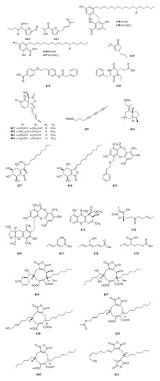 Compound 418 was tested for antimicrobial activities against five plant-pathogenic fungi A. brassicae, Colletotrichum gloeosprioides, Fusarium oxysporum, Gaeumannomyces graminis, and P. piricola. It exhibited inhibitory activity against A. brassicae and P. piricola with the same MIC value of 64 µg/mL. The positive control against A. brassicae and P. piricola was amphotericin B with MIC values of 4 µg/mL and 8 µg/mL respectively [136].