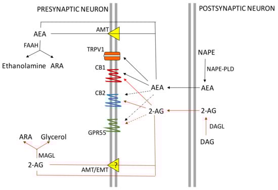 The first identified endocannabinoid was AEA that was isolated in the pig brain in 1992 immediately after the discovery of the CB1 receptor []. It is an amide derivative of arachidonic acid but conversely to many other neurotransmitters that are stored in synaptic vesicles, AEA (and 2-AG) are produced “on-demand” by neurons from the cleavage of membrane phospholipid precursors, following the depolarization of cell membrane and intracellular increase in calcium levels (Ca2+) []. However, recently an adiposomic localization of AEA has been reported in different cell types highlighting the possibility of this endocannabinoid to be stored in internal organelles []. Once produced, AEA or 2-AG can be released from the pre- or post-synaptic membrane, in the intersynaptic space; then, they travel in a retrograde direction to bind CB receptors on presynaptic terminals []. Activation of CB receptors involves the inhibition of the activity adenylate cyclase, with lower production of the second cAMP messenger, ultimately leading to a hyperpolarization of the cell membranes and activation or inhibition of specific ion channels and signaling pathways that are capable to change intracellular metabolism. Thereafter, the removal of AEA and 2-AG from the presynaptic space takes place by a selective reuptake process mediated by a membrane transporter or by passive diffusion across the membrane. Once inside the cell, AEA and 2-AG are rapidly hydrolyzed by the fatty acid amide hydrolase (FAAH) and monoacylglycerol lipase (MAGL) enzymes with their consequent deactivation (see References [,] for recent reviews). Figure 1 summarizes the retrograde action of endocannabinoids and their uptake and hydrolysis in neurons.