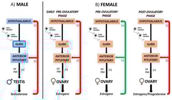 Reproduction, the process that leads to the production of gametes, is strictly controlled by the activity of the hypothalamic gonadotropin-releasing hormone (GnRH), a decapeptide released in a pulsatile manner within the hypophyseal portal system to stimulate the adenohypophysis to release in the main circulation the pituitary gonadotropins (Luteinizing hormone (LH) and Follicle Stimulating Hormone (FSH)). FSH and LH reach the gonads which in turn produces sex steroids to sustain spermatogenesis in males, follicle development, oocyte maturation, and endometrium receptivity to fertilized oocytes in females [,]. Notably, in males testosterone exerts negative feedback on GnRH secretion; in females, estradiol exerts homeostatic, negative feedback on GnRH secretion, but at the end of the follicular phase, the rise in estradiol levels causes the switch into a positive feedback that sustains the GnRH peak and LH surge responsible for ovulation [] (Figure 2).
