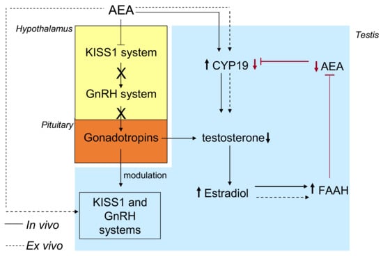 Recently, a molecular mechanism involving both the kisspeptin system and FAAH has been suggested in the anuran amphibian, the frog Pelophylax esculentus, a seasonal breeder with a complete, well-characterized ECS [,] involved in the central and local control of reproduction with effects on steroid biosynthesis and sperm maturation [,,,,,,]. As for mammals, in this animal model AEA via CB1 receptor centrally impairs the hypothalamic activity of the GnRH system [], which in the frog comprises two molecular forms (GnRH1 and GnRH2) as ligands and three receptors [], thus centrally modulating steroid biosynthesis []. As reported by Ciaramella et al., in vivo AEA treatment had different outcomes on the HPG axis in frog: (i) decreased the expression levels of Kiss1 and Kiss1R protein and GnRHs and GnRHRs mRNA in brain and testis; (ii) impaired the expression of key steroidogenesis enzymes (i.e., Cyp17 and 3ß-HSD) causing a drop in intratesticular testosterone level; (iii) increased the expression of Cyp19, causing the increase of intratesticular estradiol levels, and the estradiol dependent expression of FAAH, []. Interestingly, the kisspeptin system not only is the major upstream modulator of GnRH, but it is also involved in sex steroid feedback mechanisms [], and as both ECS [] and GnRH system [], is an intratesticular modulator of spermatogenesis [,,,] with functions related to Leydig cells activity, spermatogenesis progression [,,] and a dose-dependent suggestive role in the balance of estradiol and testosterone levels []. To discriminate between centrally mediated and direct intragonadic effects, ex vivo incubations of the testis with AEA ± rimonabant (SR141716), the antagonist/inverse agonist of CB1 receptor were carried out, revealing direct CB1-mediated effects on FAAH, Cyp19, and GnRH system [,]. Since the AEA inductive effects on FAAH, the possible involvement of estradiol signaling were assayed incubating frog testis with ICI182-780—a potent ER inhibitor and therefore stimulating with AEA. The preliminary administration of ICI182-780 locked any positive effects of AEA on FAAH expression, providing evidence of combined centrally-mediated, and intratesticular route in the control of sex steroid biosynthesis. Centrally, AEA negatively affects the hypothalamic kisspeptin system to switch off the HPG axis, thus causing testosterone decrease; locally, testosterone is further converted into estradiol, which in turn induces FAAH, indicating the existence of a fine regulatory loop in the modulation of AEA tone (Figure 3).